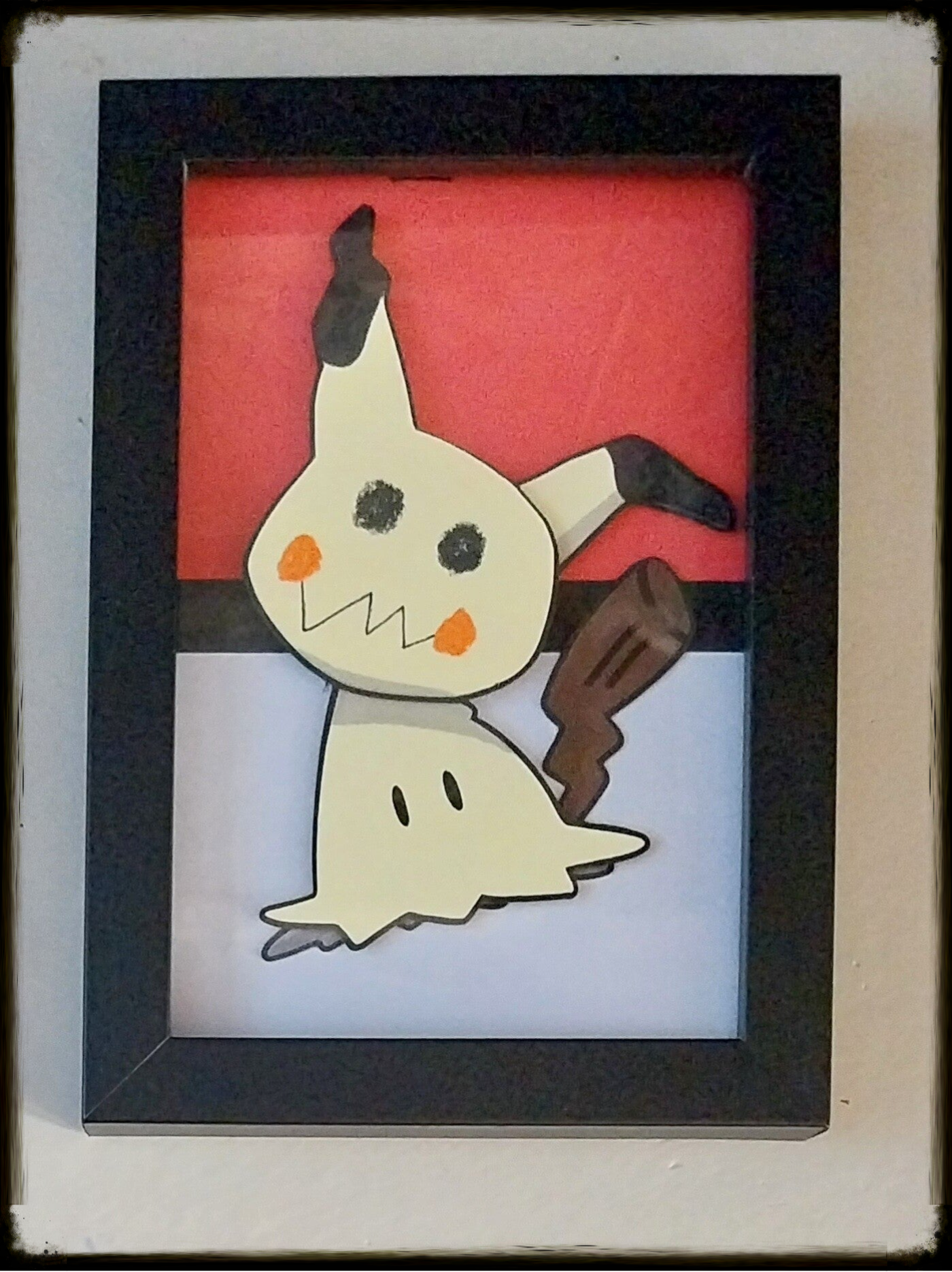 Peek-a-boo, I scare you! Meet Mimikyu, masterfully pieced together in paper into a 10×15 cm frame that's equal parts adorable disguise and existential crisis. Under that tattered yellow rag with the wonky Pikachu ears and crayon-red cheeks lies a shadowy ghost just dying (literally) for some love — small enough to lurk innocently on your nightstand, yet spooky enough to make you double-check under the bed at 3 a.m.
